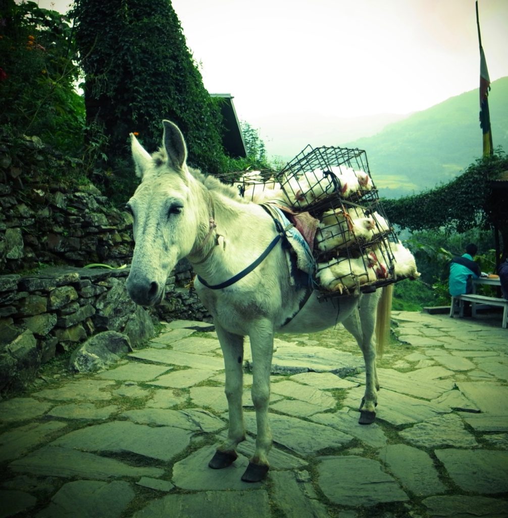 山の上にある村に荷物を上げるために、馬を使う。