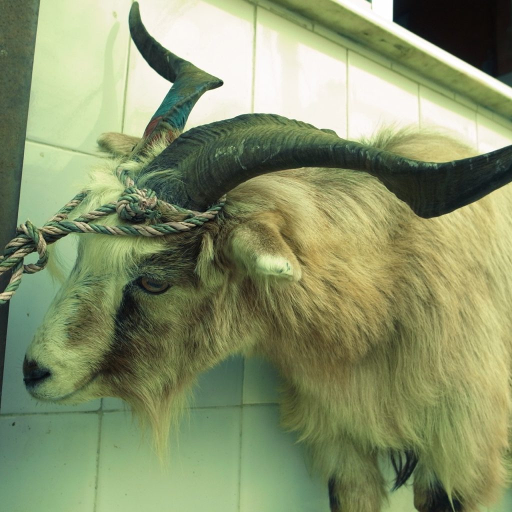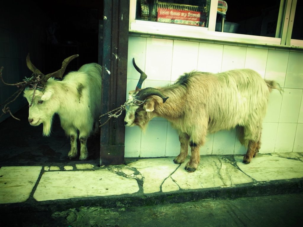 チャングラ チャングラ(山羊の一種) 毛がとても長く、温厚だった。 1キロ1300ルピーという超高価なお肉。 丸ごと買い取ってペットにするという手もあるが、きっと盗まれて食べられるだろう。 今頃は、誰かの血となり肉となっているであろう。